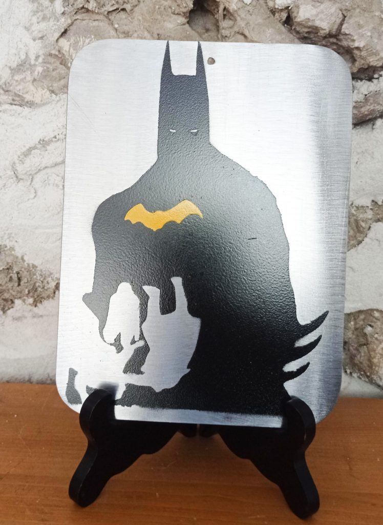 Batman sur plaque en acier brossé.