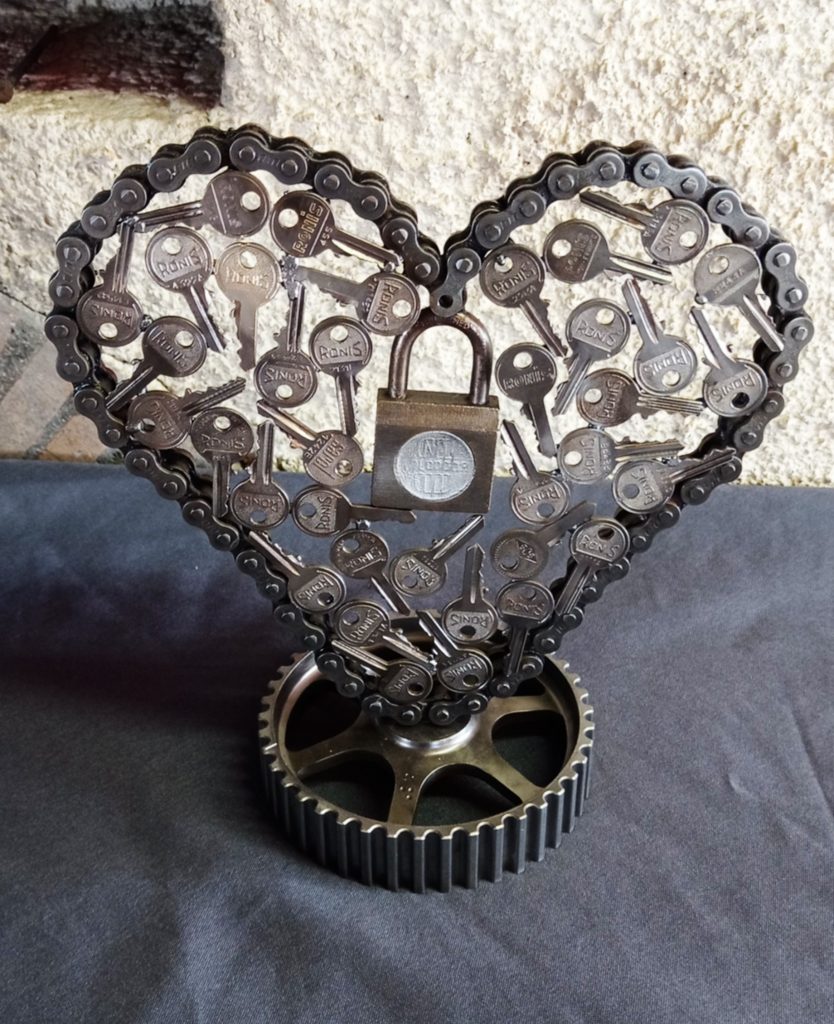 Petit coeur réaliser avec des clefs et un cadenas, entouré de chaine de moto.