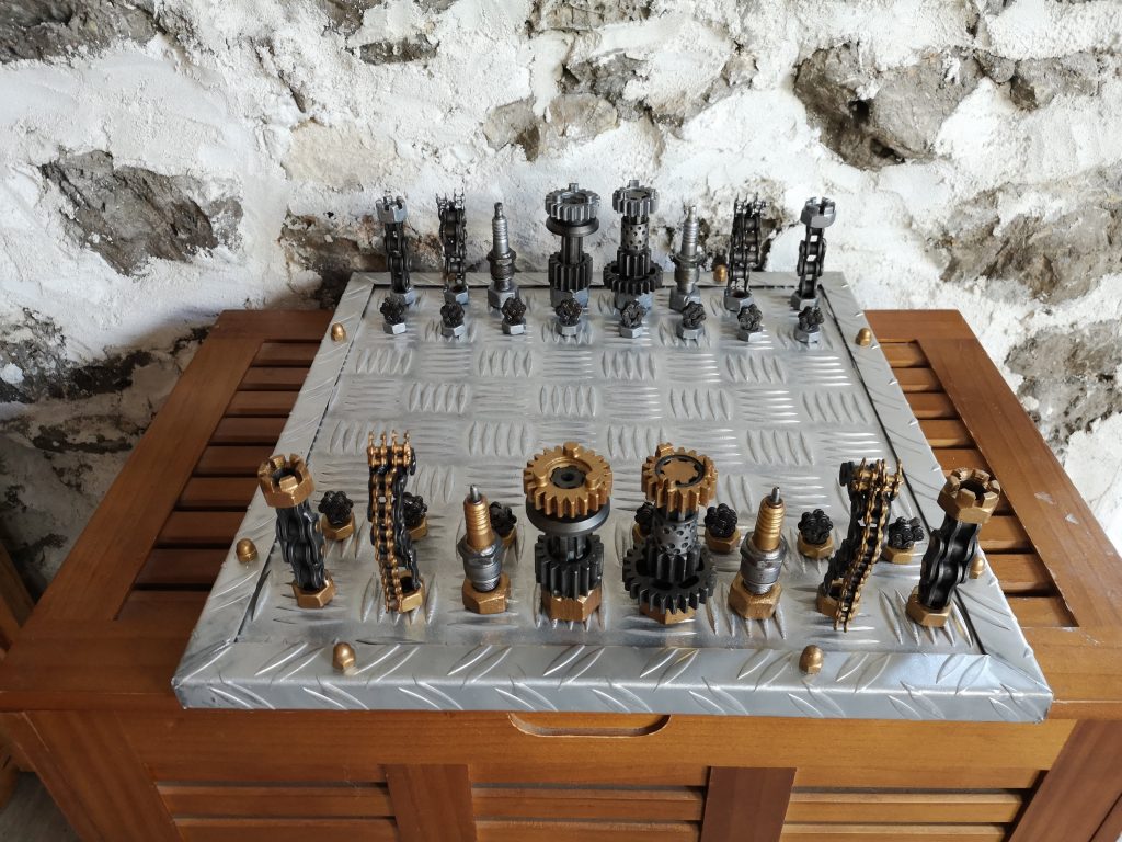 Echiquier réalisé entièrement avec des pièces de motos. Chaînes, bougies et pièces moteurs composent les pièces, différenciées par des touches de peintures argent et doré. Le plateau est en bois recouvert d’une plaque d’aluminium.