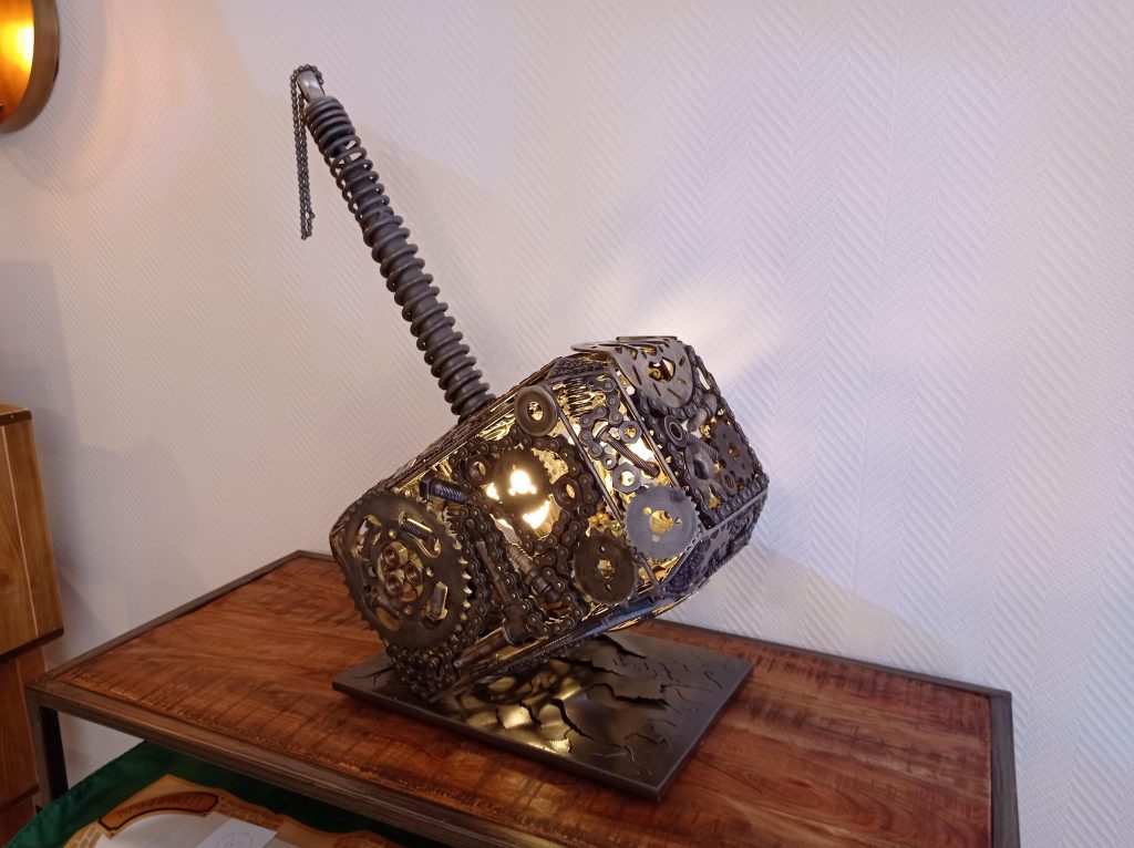 Mjolnir le marteau du Dieu du tonnerre Thor transformé en lampe. Entièrement réalisé à partir de pièces de motos. Disques de freins, bougies, pièces moteurs, chaîne et autre forment la structure. Aucune soudure n’est visible. Le manche est fait d’amortisseurs et le socle est une tôle découpée au plasma et soudée sur un fer plat pour assurer la stabilité de l’ensemble. L’ampoule à l’intérieur est une ampoule connecté directement au téléphone pour en changer la couleur et adapter l’ambiance en fonction de vos envie.