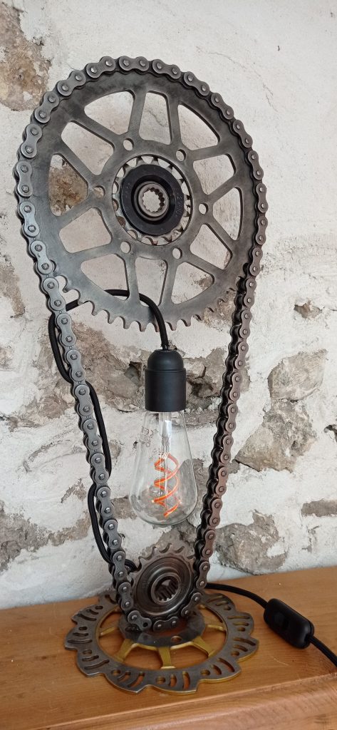 Lampe sur pied fabriquée a partir d’une couronne et d’un pignon relié par une chaîne de moto. L’ampoule est connectée au téléphone pour changer d’ambiance selon vos envies.