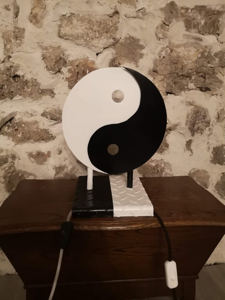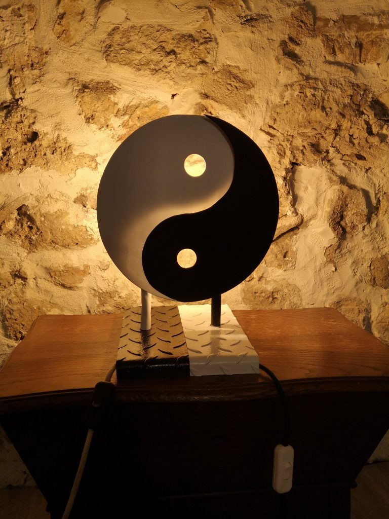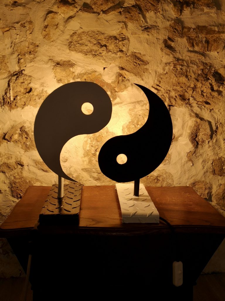 Lampe reprenant le célèbre motif du yin et du yang. Réalisé en tôle découpé à la main. Il y à en réalité 2 lampes qui peuvent être utilisé ensemble ou séparément.
