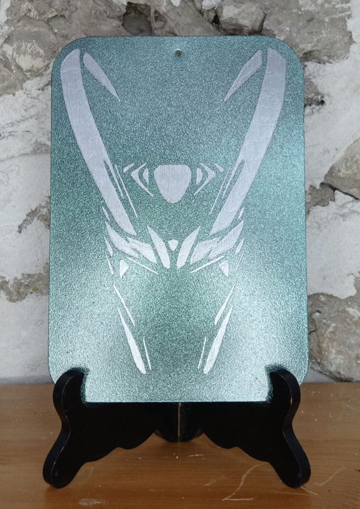 Motif du casque de Loki gravé sur une plaque ne acier