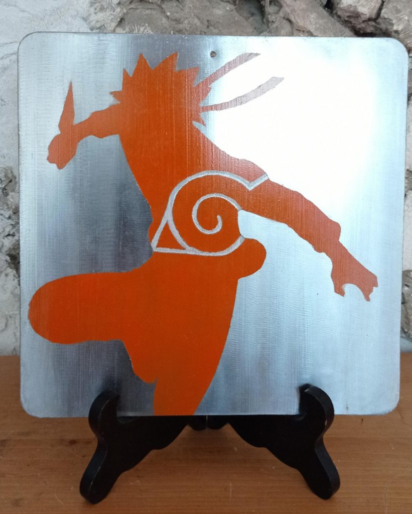 Naruto sur plaque en acier brossé à la main et logo gravé à la main.