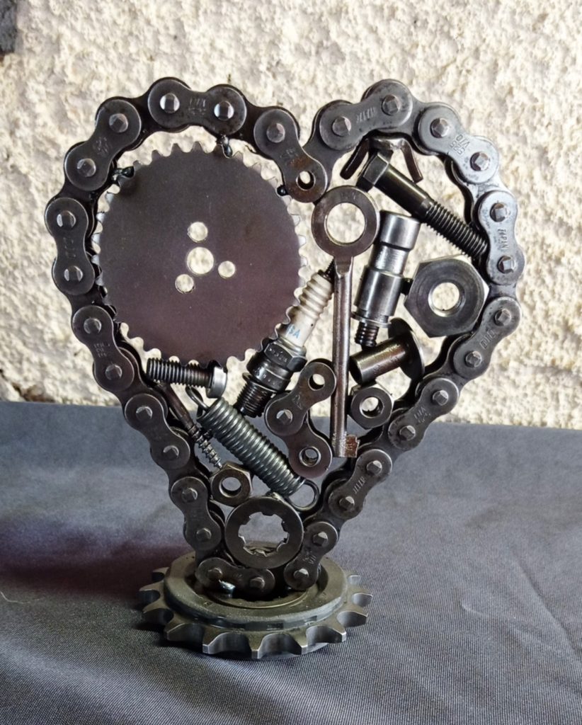 Petit coeur réaliser avec des matériaux de récupération, entouré de chaine de moto.