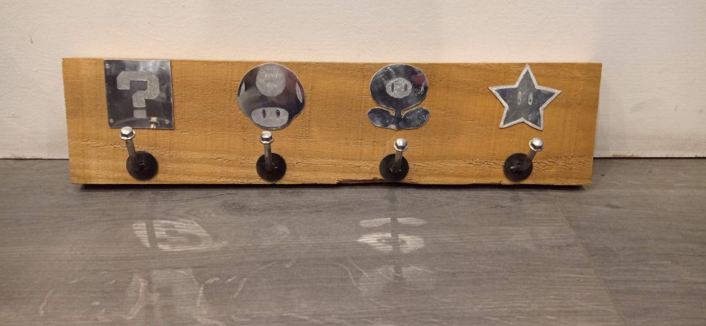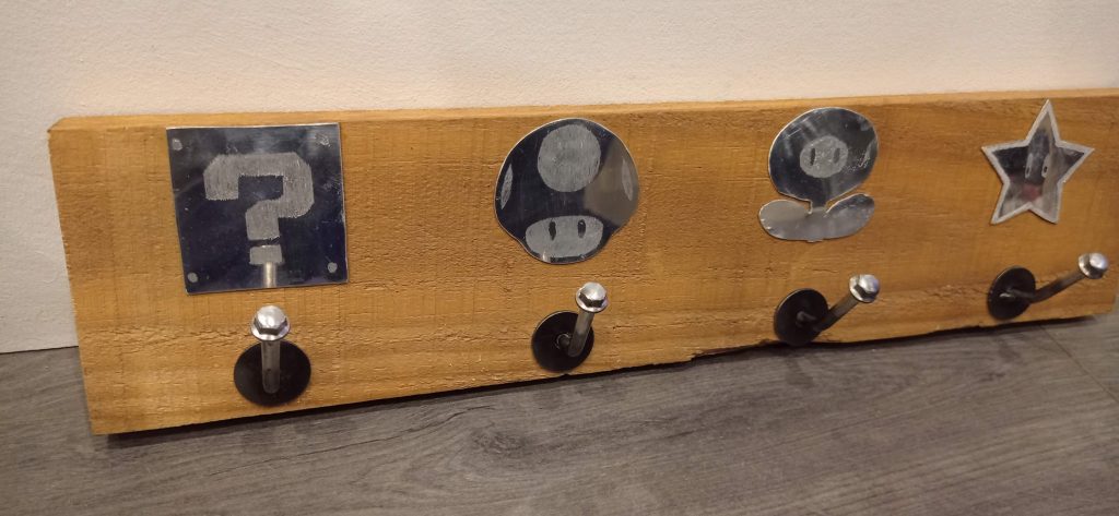 Porte manteau inspiré de l’univers de la série de jeu vidéo Super Mario. Le point d’interrogation, le champignon, la fleur et l’étoile sont découpés dans une tôle d’alu et gravé à la main.