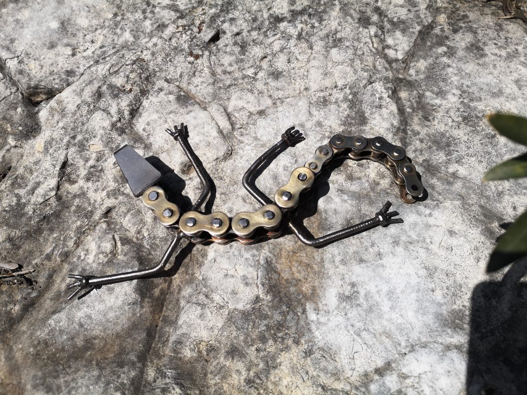 Salamandre fait avec des chaînes de motos et quelques morceau de fer rond.